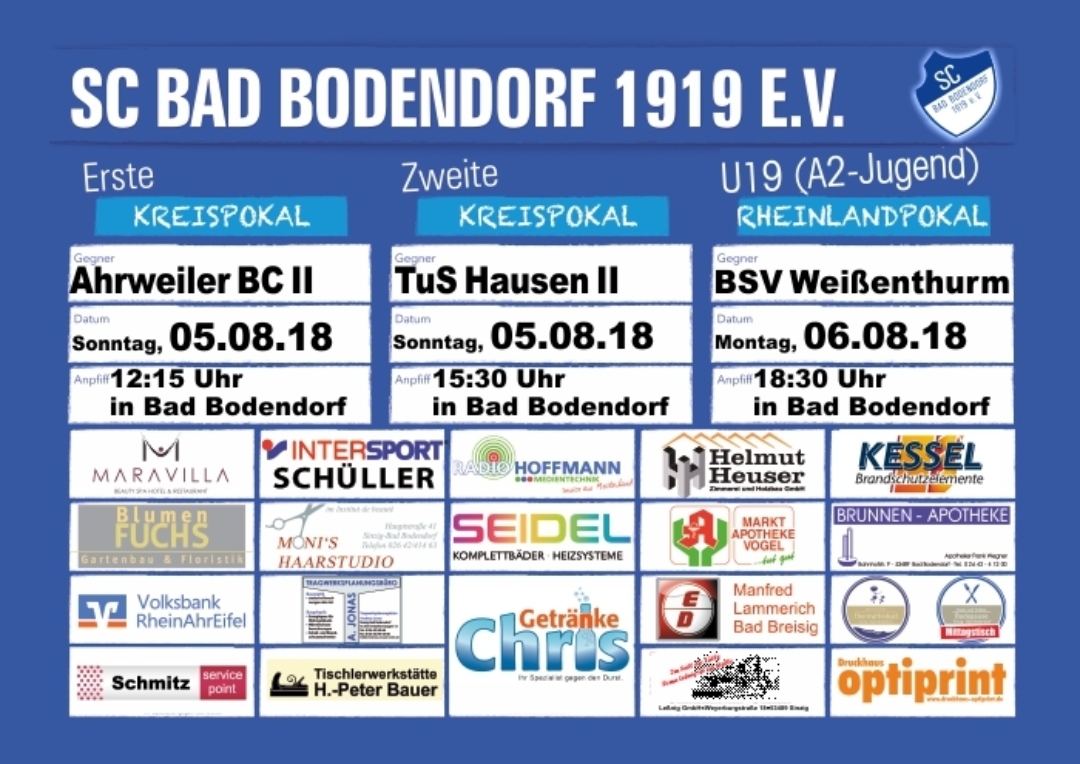 Am kommenden Wochenende beginnt für die 1. und 2. Mannschaft des SC Bad Bodendorf die neue Saison. Wie immer beginnt die Saison mit den Kreispokalspielen. Als erstes muss die 1. Mannschaft am Sonntag (05.08.18) um 12.15 Uhr auf heimischen Geläuf gegen die 2. Mannschaft des BC Ahrweiler antreten. Der Aufsteiger aus der Kreisstadt ist den Mannen um Trainer Elmar Schäfer noch aus der letzten Saison sehr gut gekannt. Man kann davon ausgehen, dass Elmar mit Co-Trainer Jürgen Klapperich und Torwarttrainer Peter Hüffel alles daran setzen werden, den Platz als Sieger zu verlassen.
