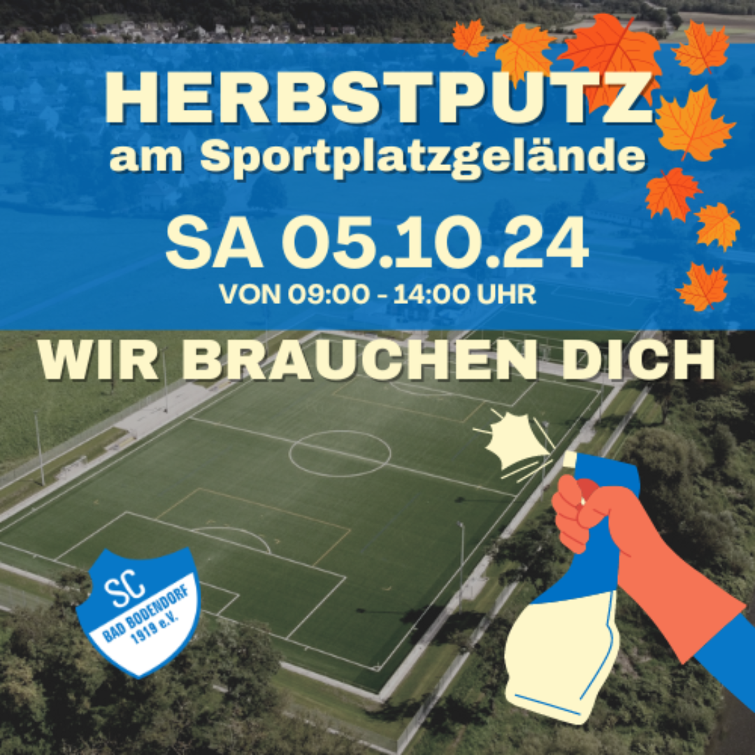 Am Samstag, den 05.10.24 von 09:00 bis 14:00 Uhr, findet der große Herbstputz statt. Jeder Spieler, Trainer oder Elternteil freut sich über ein sauberes Sportplatzgelände! Deshalb ist es wichtig, dass wir alle gemeinsam anpacken!