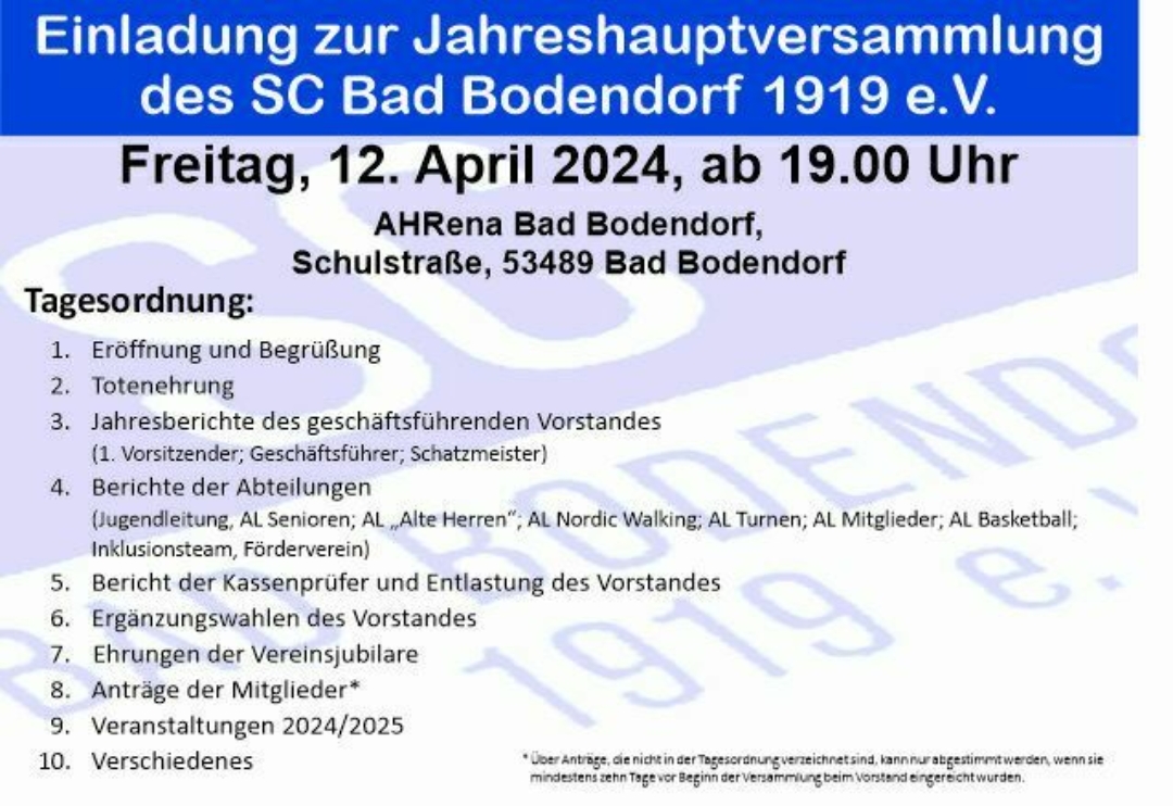 weiterlesen →Am 16.06.2023 fand in der „AHRena“ in Bad Bodendorf die diesjährige Jahreshauptversammlung des SC Bad Bodendorf statt. Die Versammlung wurde um 19 Uhr vom 1. Vorsitzenden Lutz Baumann eröffnet und von rund 60 Mitgliedern besucht. Nach der Begrüßung der Anwesenden durch den 1. Vorsitzenden begann die Tagesordnung.