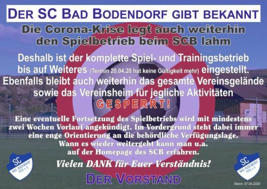 weiterlesen →BAD BODENDORF-LB. Die Corona-Krise lässt auch den SC Bad Bodendorf 1919 e.V. nicht unberührt. Das neben der Einstellung des Trainings- und Spielbetriebes, die Schließung des Vereinsgeländes und –heimes nun auch noch viele weitere Termine abgesagt werden müssen, hatten die Verantwortliches des SCB auch nicht gedacht.