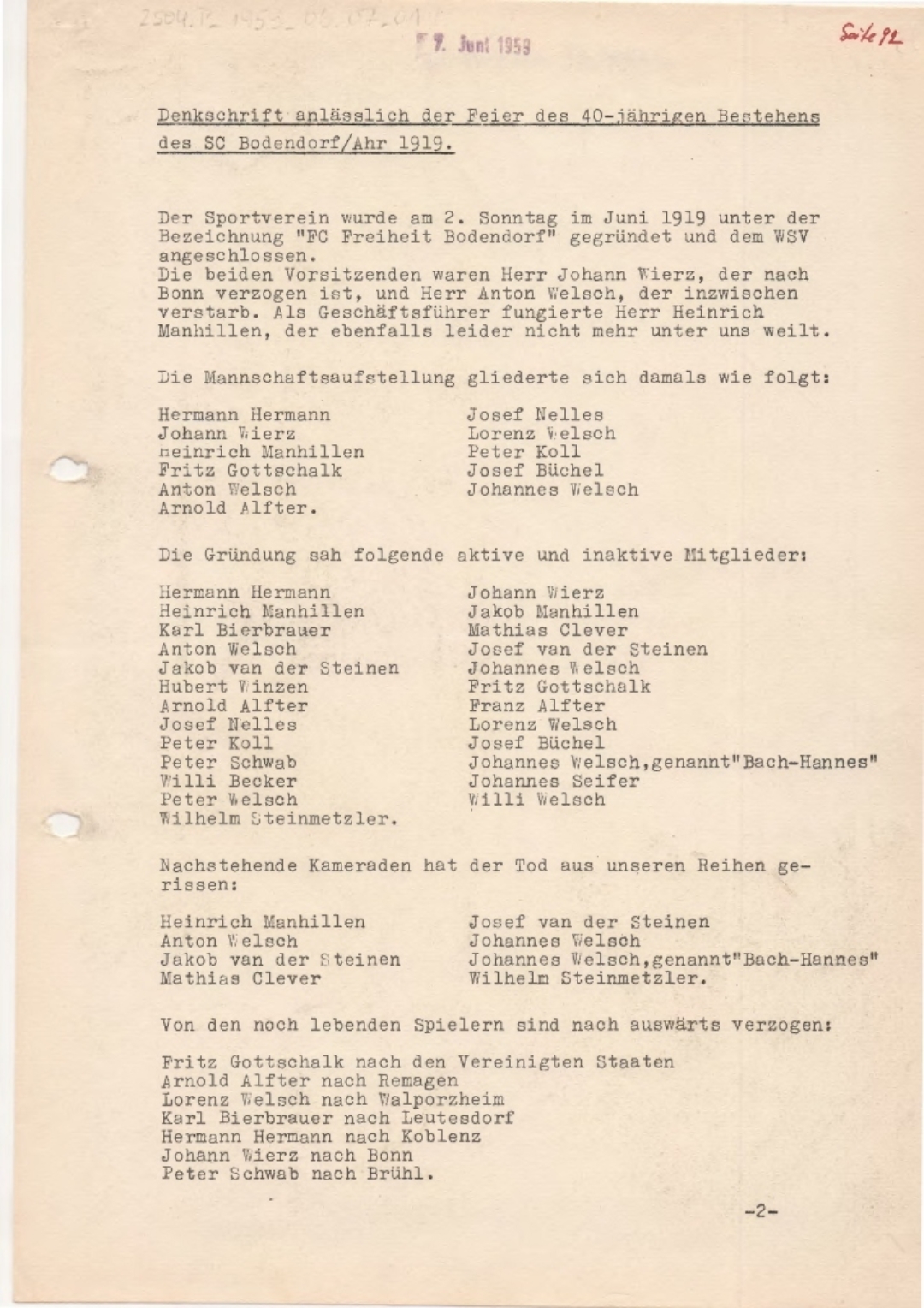 Durch einen Zufall bekam in den letzten Tagen Josef Erhard vom Heimat- und Bürgerverein ein Kirchenbuch in die Hände, bei dem auch der SC Bad Bodendorf Erwähnung fand. Vermutlich war es Fritz Voigtländer, der die Denkschrift anlässlich des 40jährigen Jubiläums des SCB verfasst hat. Die Namenskürzel F.V. deuten auf jeden Fall dahin. Es ist schön zu lesen, wie der ehemalige Vorsitzende und Ehrenvorsitzende des SC Bad Bodendorf (1959 - 1966) die Sport- und Vereinskameraden zu seiner Zeit gesehen und geehrt hat.