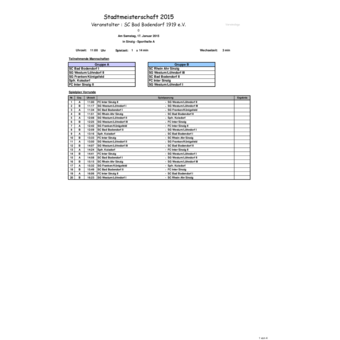 Am Samstag, 17. Januar 2015 ist die Hallen-Stadtmeisterschaft der Senioren in Sinzig. Ausrichter der Veranstaltung ist dann der SC Bad Bodendorf. Die Auslosung der Gruppen wurde am Donnerstag, 18.12.2014 vorgenommen und ergab folgendes Ergebnis.