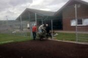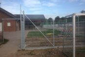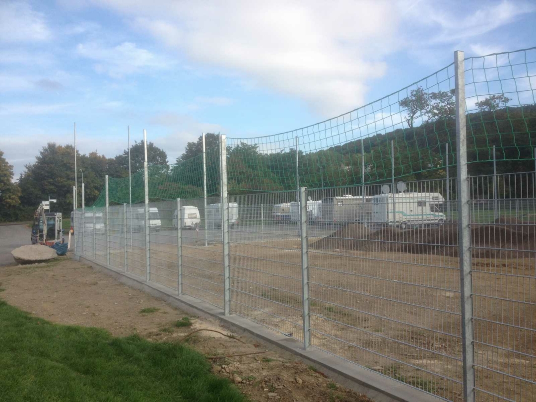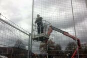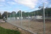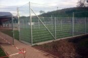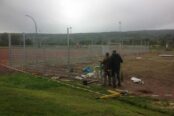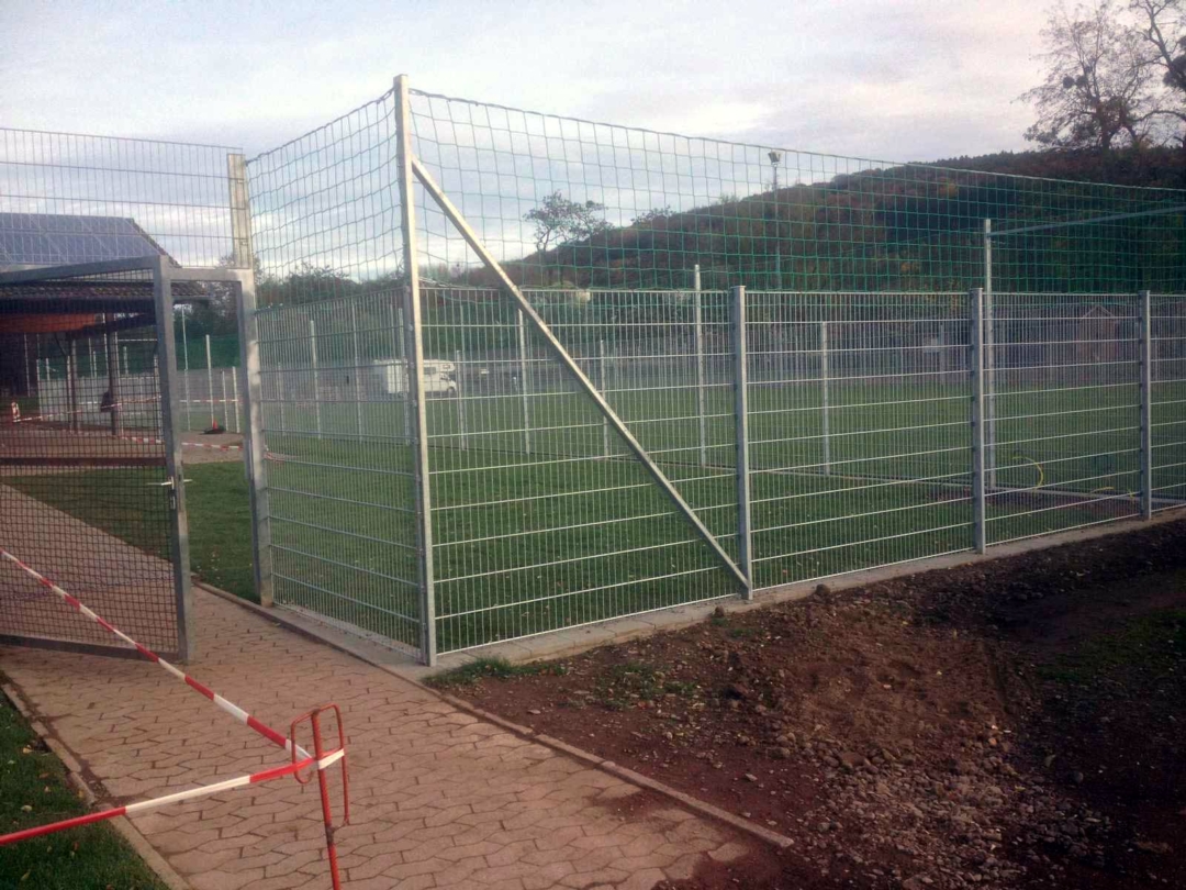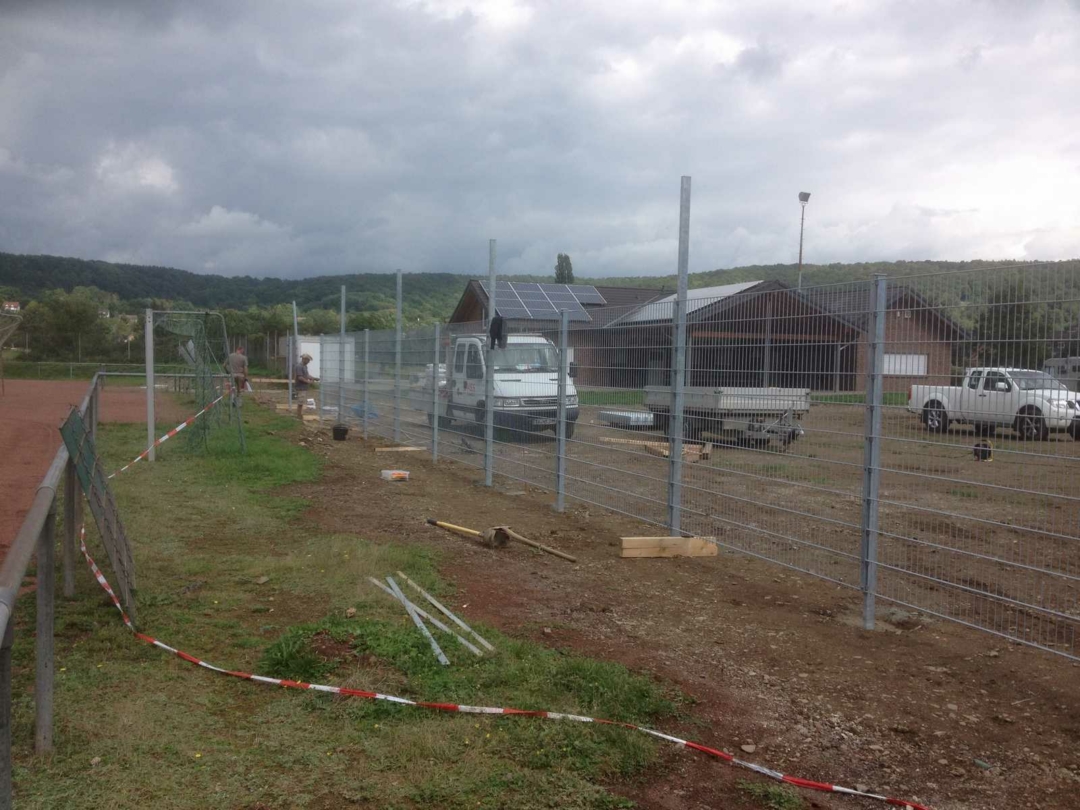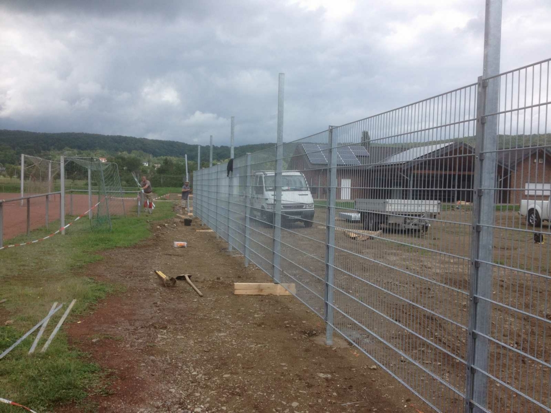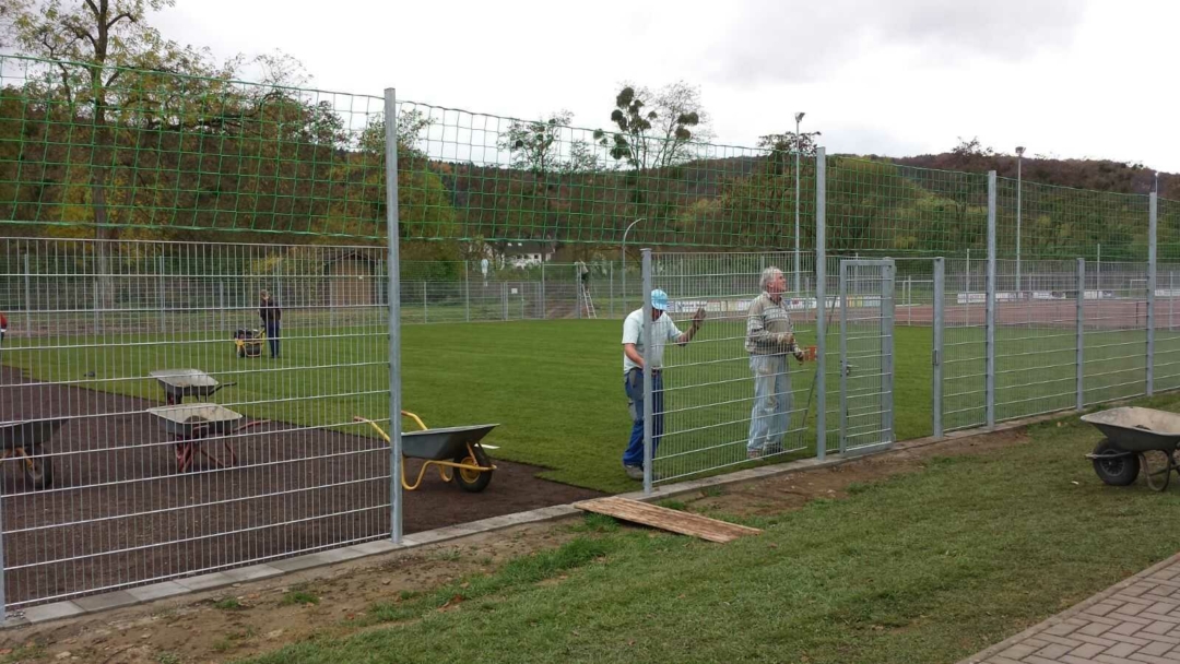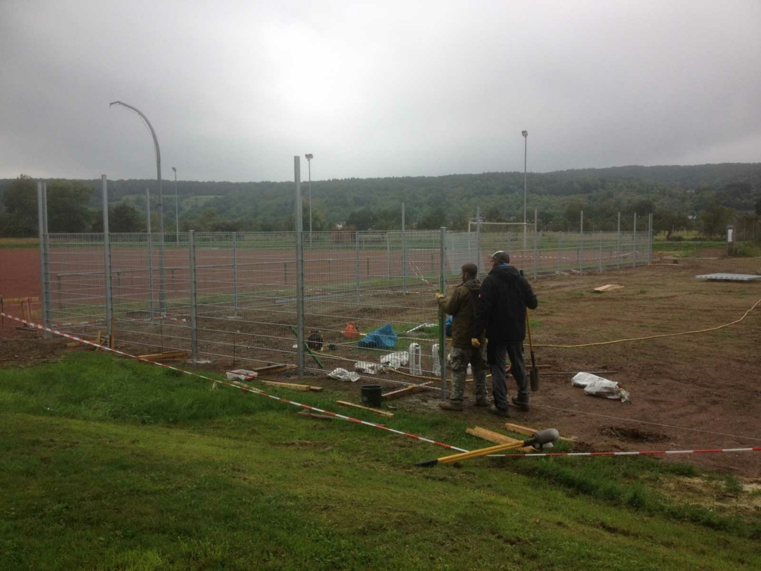 Zaunbauer setzen zum großen Sportplatz die letzten Zaunstangen, die