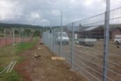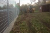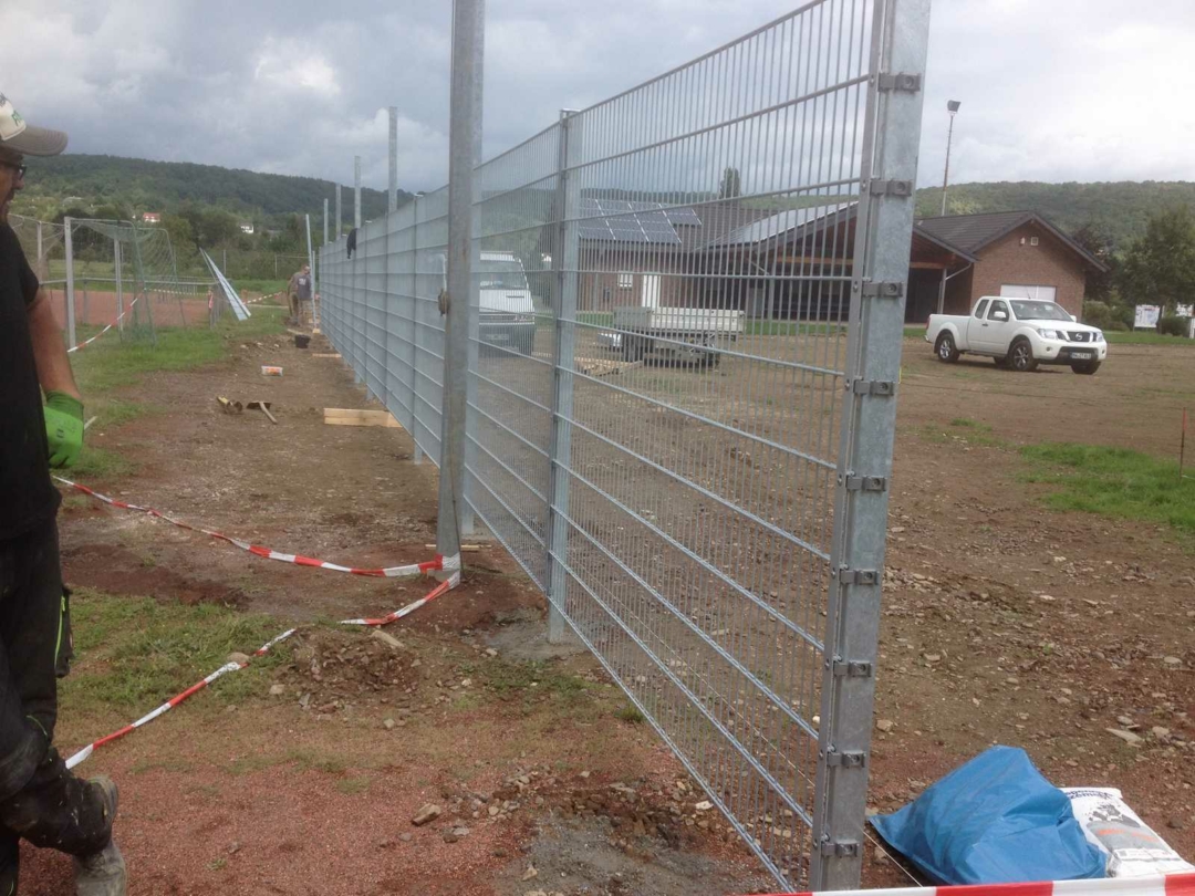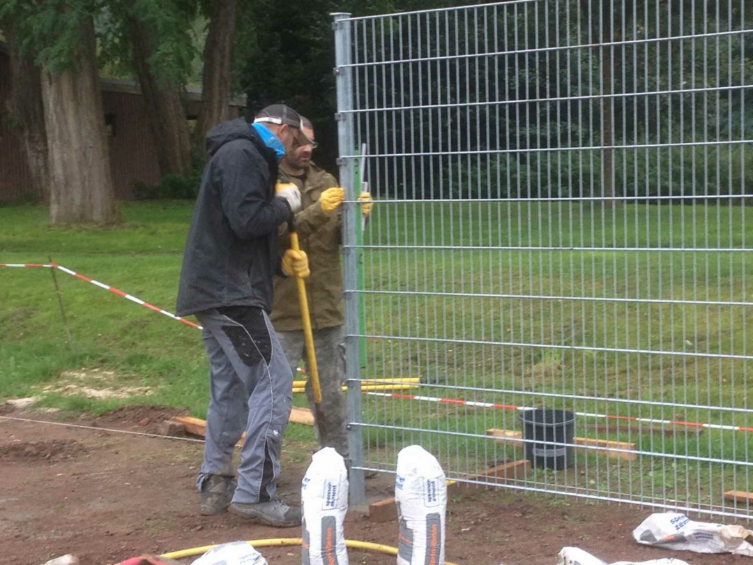 02.09.2015: Der Bau der Zaunanlage geht weiter. Pfosten werden gesetzt und die Doppelstabmatten eingehängt.