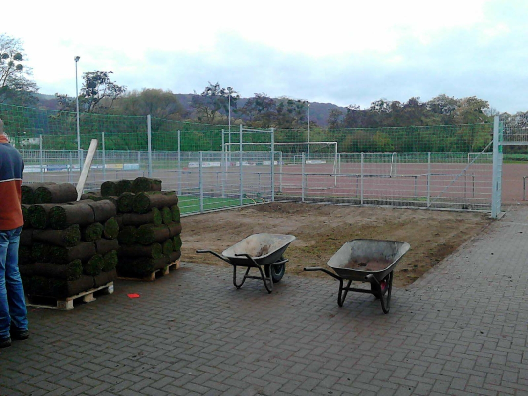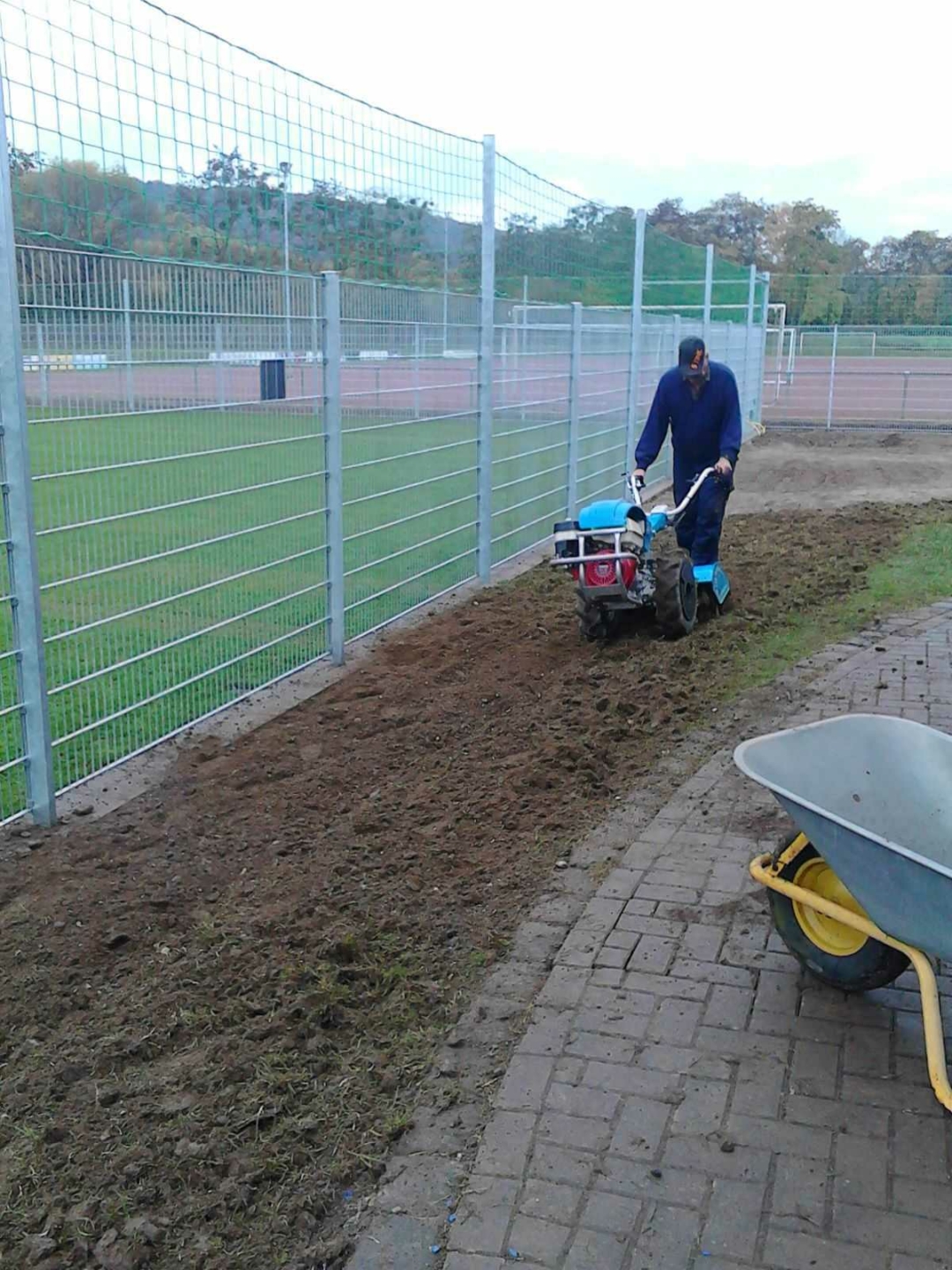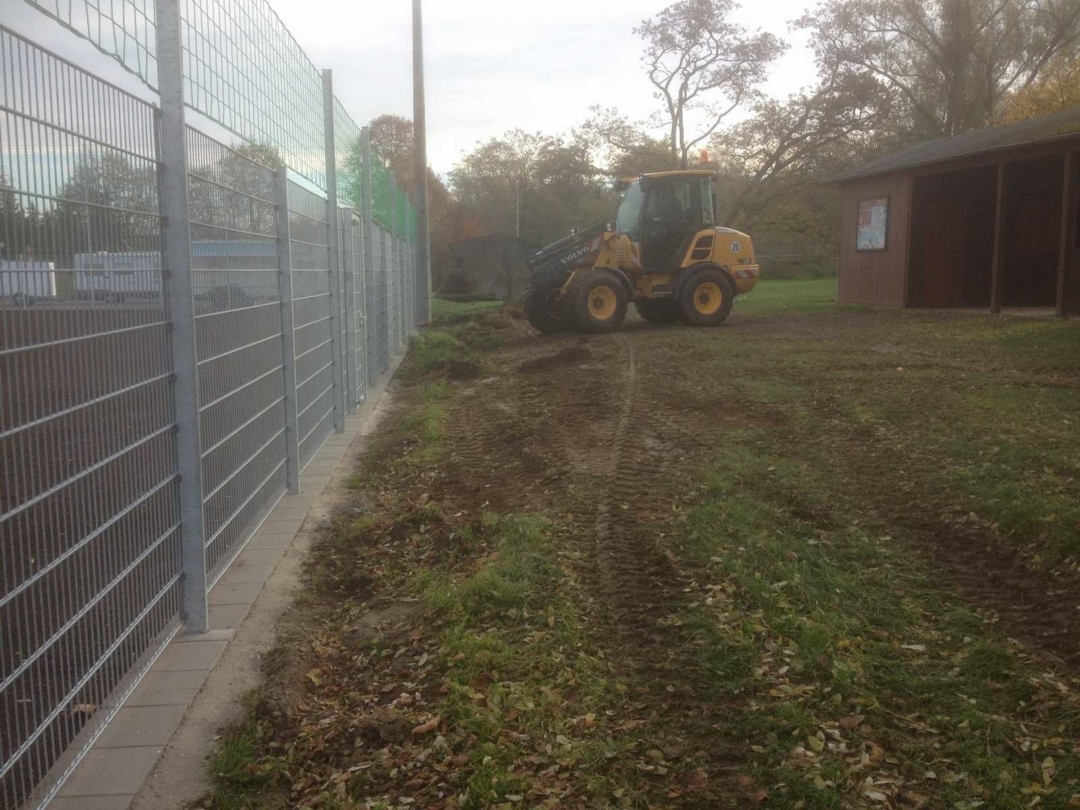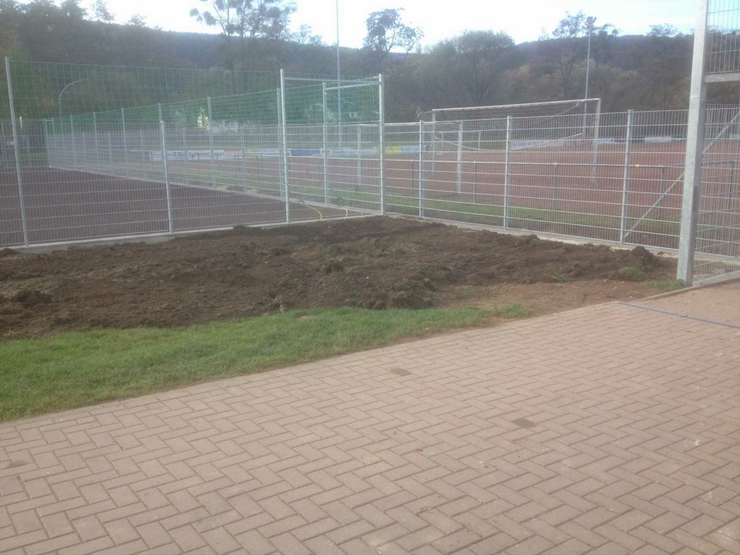 09.-12.11.2015: Städtische Bedienstete bearbeiten das Aussengelände um das Kleinspielfeld, d.h. Mutterboden wird entsprechend verteilt und Rasen eingesät.