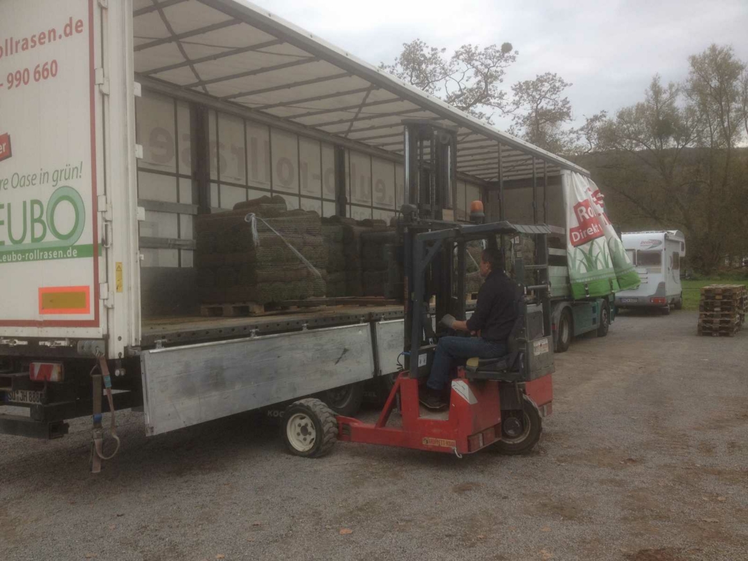 Der Rollrasen wird angeliefert und die ersten Bahnen verlegt. Mit