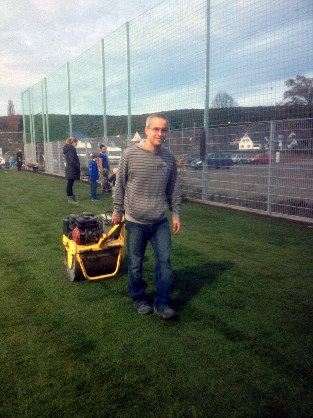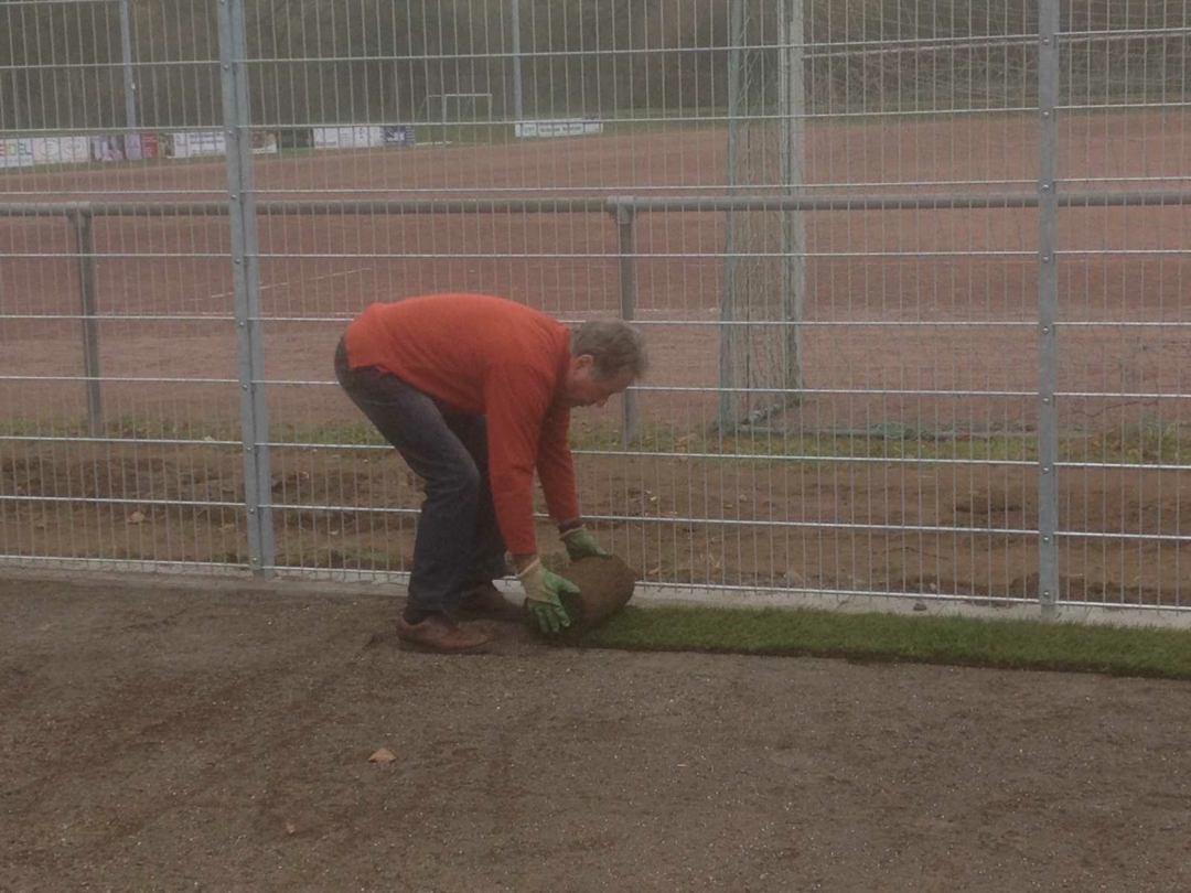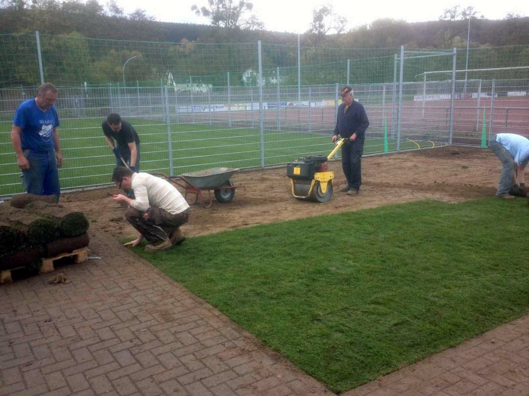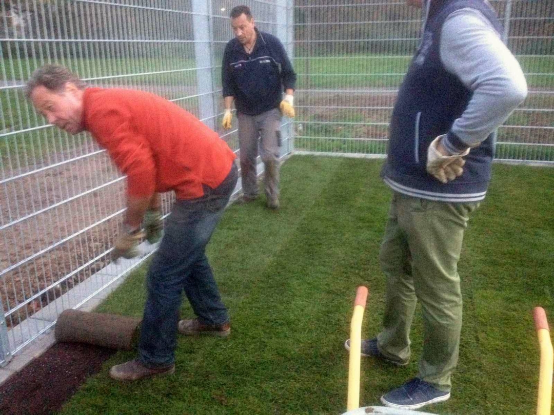Helfern der Rollrasen weiter verlegt. Mario Bell kümmert sich um die