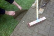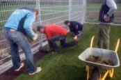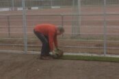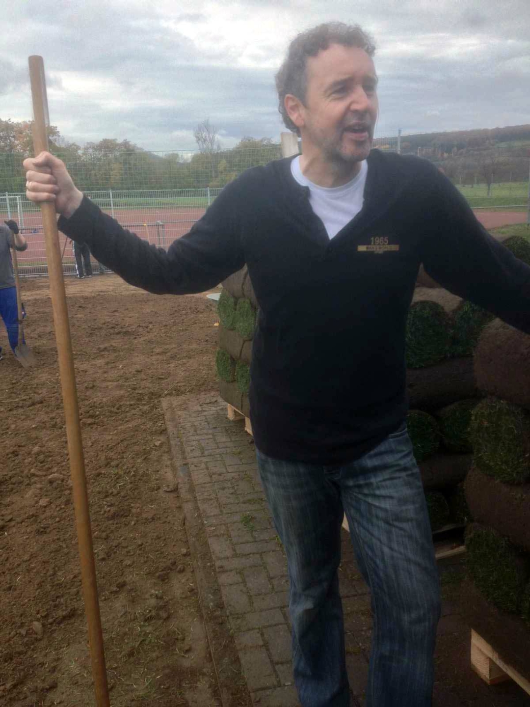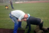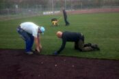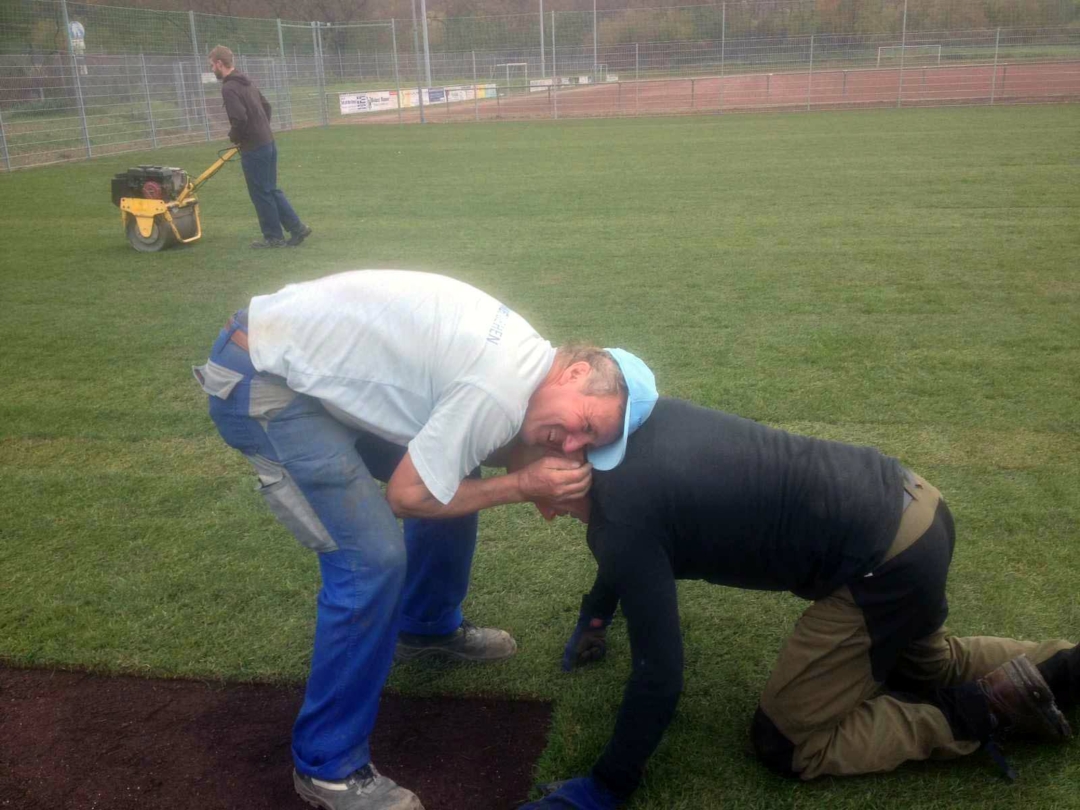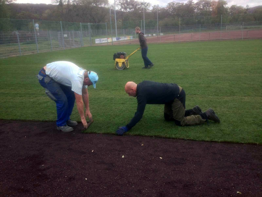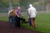 Helfern der Rollrasen weiter verlegt. Mario Bell kümmert sich um die