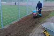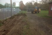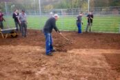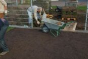 Spielfläche wird mit weiterem Mutterboden aufgefüllt und plan gezogen.