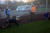 16.10.2015: Unermüdlich arbeiten die freiwilligen Helfer um die Spielfelddecke plan zu ziehen.