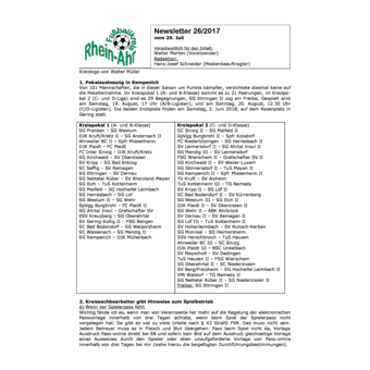 Pokalauslosung in KempenichKreissachbearbeiter gibt Hinweis zum SpielbetriebJosef Frings macht UrlaubJunioren sind in Staffel eingeteiltZur KlarstellungAnlagen: Prozessablauf Spielrechtprüfung Online mit "Elektronischer Passmappe"Anlagen: Hochladen und Veröffentlichen von Spielerfotos im DFBnet