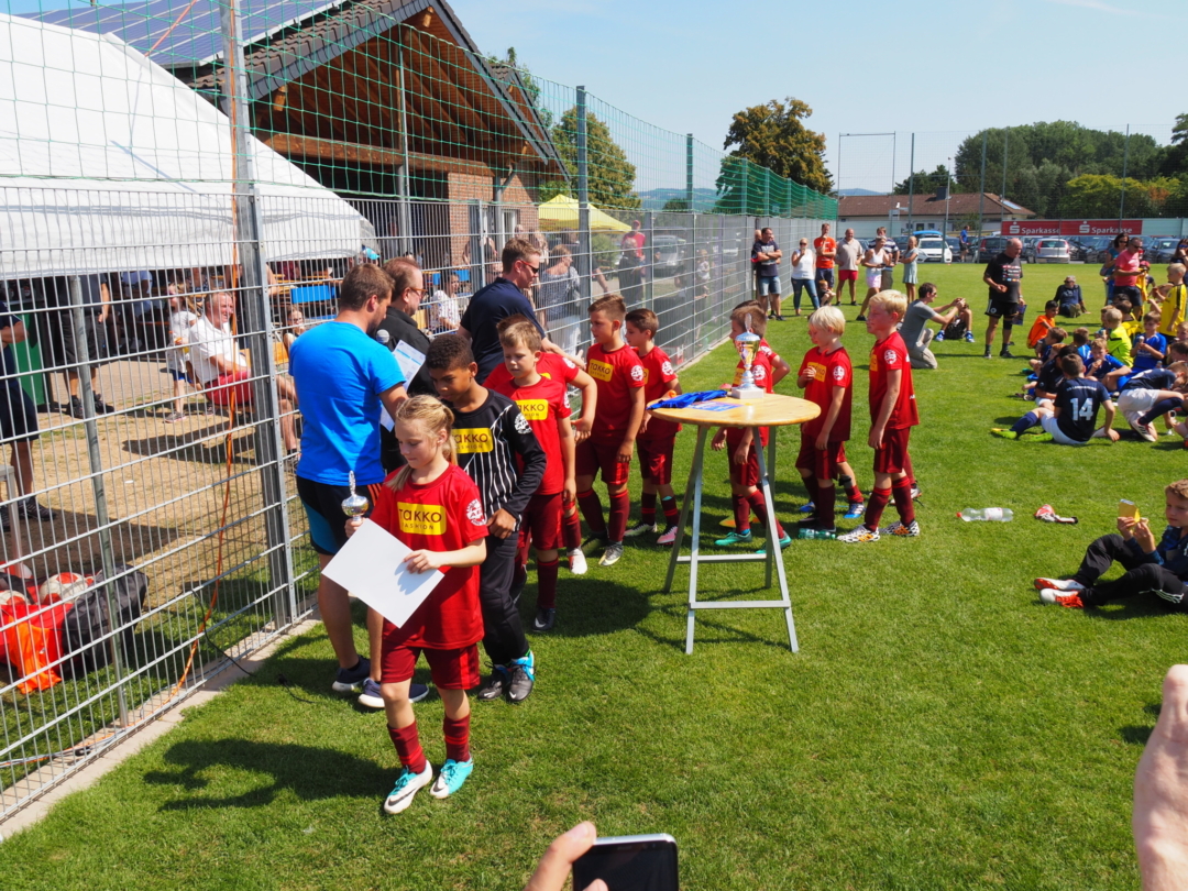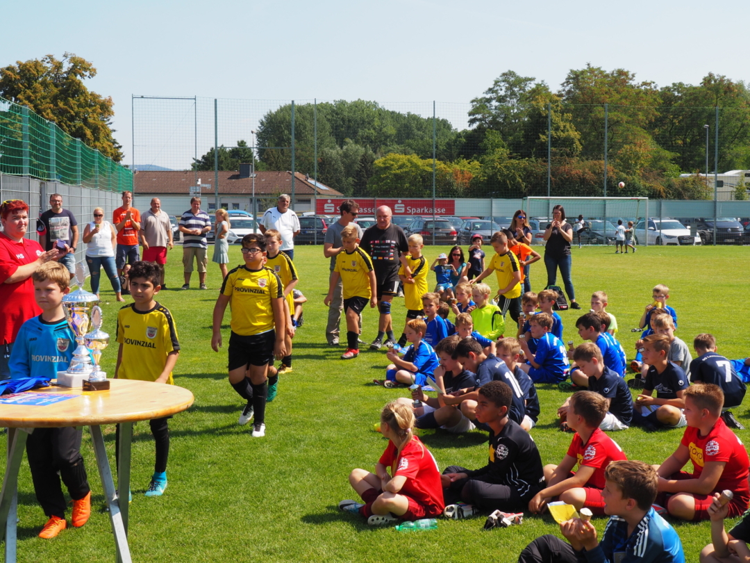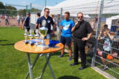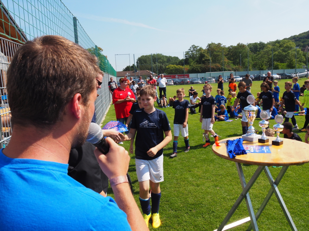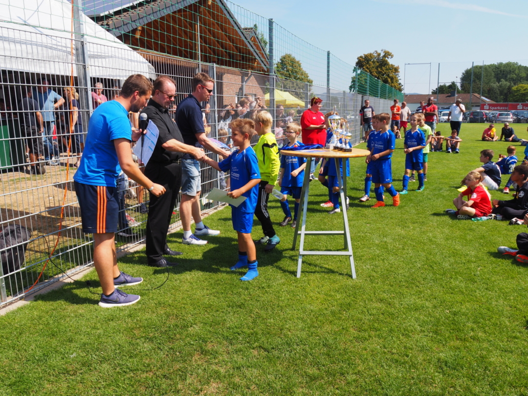 Jugendleiter Jörg Baltes, Harald Monschau vom SeniorenZentrum Maranatha, Ehrenbeiratsmitglied Klaus Unkelbach und Geschäftsführer Jan-Niklas Ellerich, der während des gesamten Turniers moderierte, liesen es sich nicht nehmen, den E-Junioren neben der verdienten Urkunde, natürlich auch den Wanderpokal, Medaillen und als kühle Überraschung ein Eis zu übergeben.