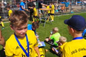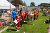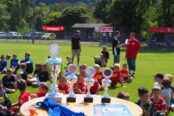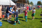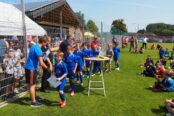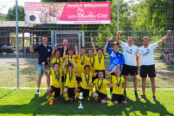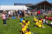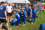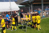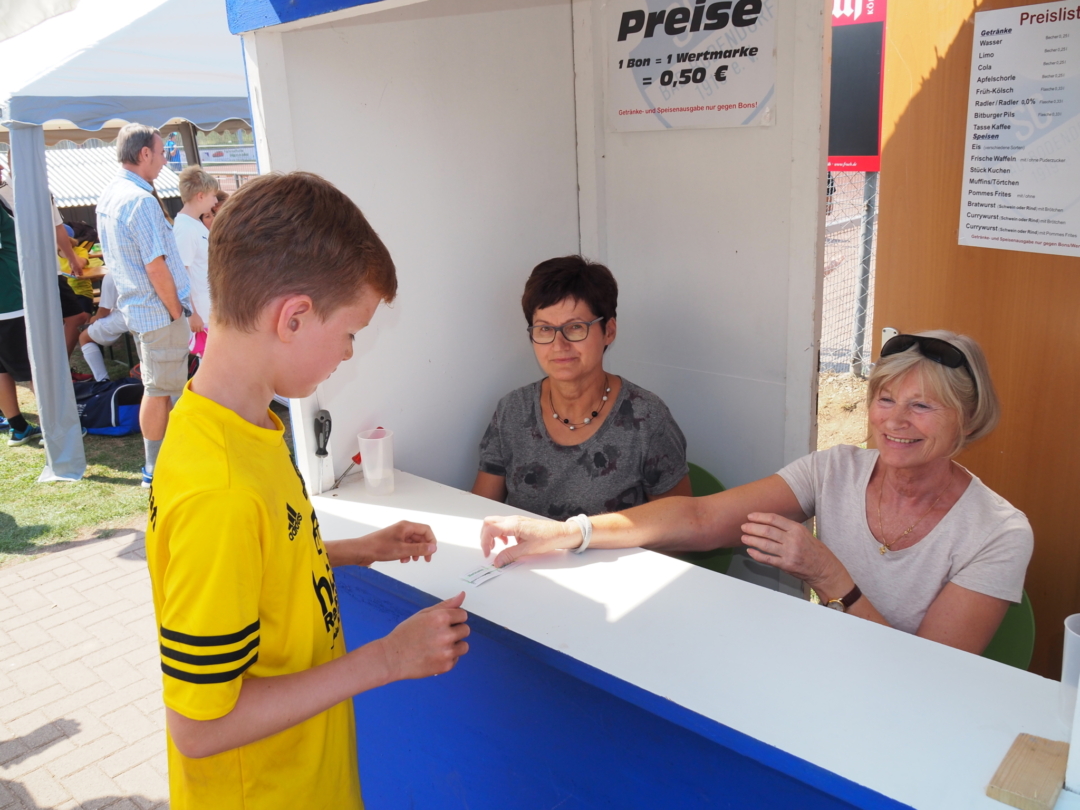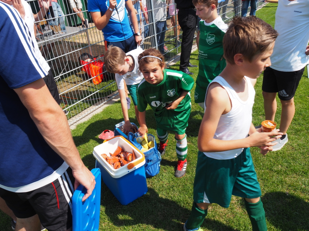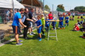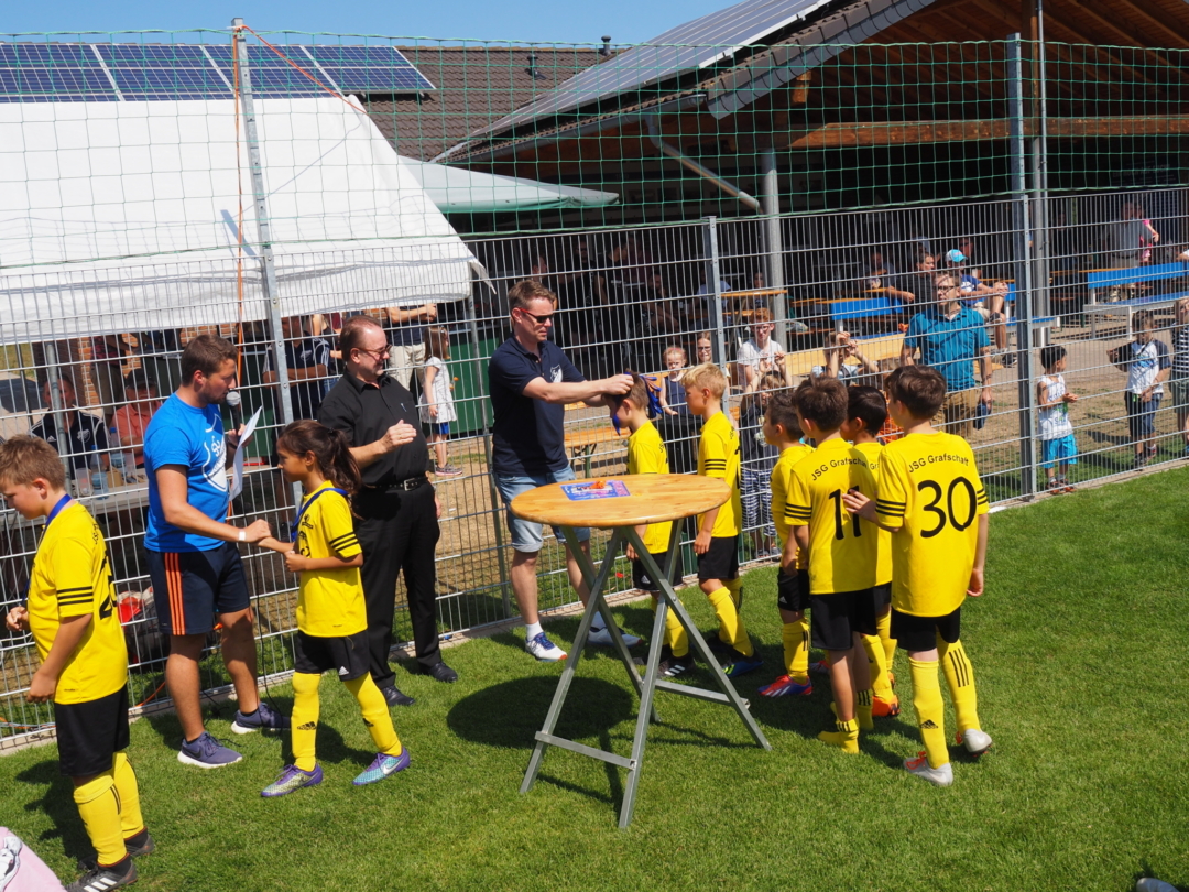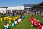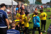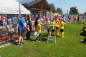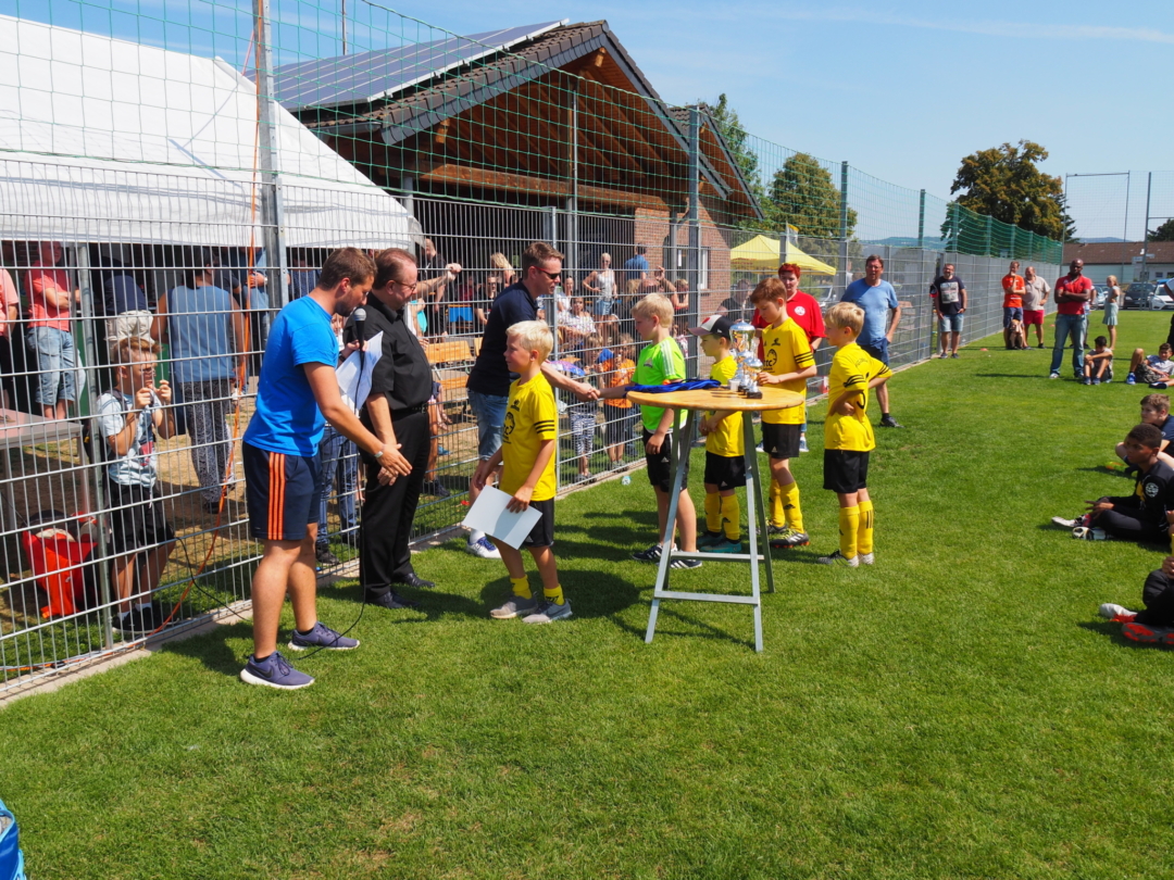 Jugendleiter Jörg Baltes, Harald Monschau vom SeniorenZentrum Maranatha, Ehrenbeiratsmitglied Klaus Unkelbach und Geschäftsführer Jan-Niklas Ellerich, der während des gesamten Turniers moderierte, liesen es sich nicht nehmen, den E-Junioren neben der verdienten Urkunde, natürlich auch den Wanderpokal, Medaillen und als kühle Überraschung ein Eis zu übergeben.