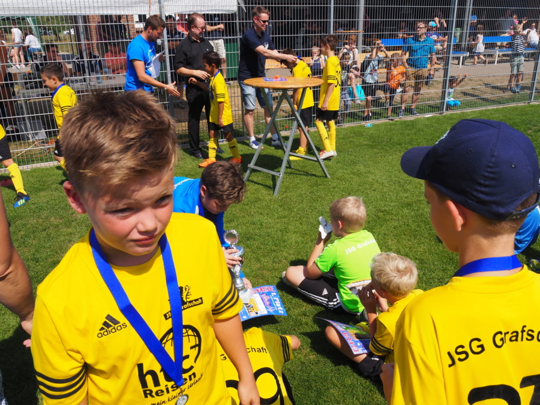 Bei wieder bestem Wetter begann der 2. Turniertag. An diesem Tage sollten allerdings nur die F-Junioren ihr Bestes geben. Bereits um 11.00 begann das Turnier mit den Mannschaften des Ahrweiler BC I, SC Kempenich, JSG Wehr I, SC Bad Bodendorf I, SC Rhein-Ahr Sinzig, JSG Westum-Löhndorf II, SG Landskrone Heimersheim und dem SC Bad Bodendorf II. Da es bei den F-Junioren keine Wertung gibt, konnten alle Anwesenden zwar viele schöne Spiele und Tore sehen, allerdings keine Tabelle. Was dem Ganzen jedoch keinen Abbruch tat, denn alle Mannschaften waren letztendlich Sieger, mit dem was sie zeigten. ZumSelbstverständlich gab es auch für die "Kleinen" zum Abschluss Urkunden, Medaillen und die obligatorische Abkühlung, ein Eis.