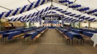 Das Festwochenende wurde bereits einige Tage vorher mit dem Aufbau des Festzeltes und dessen Dekoration eingeläutet. Waren beim Aufbau besonders die „älteren“ SCB-Anhänger bei strömenden Regen besonders fleißig, so kamen bei der Dekoration die jüngeren, meist weiblichen SCB‘lerinnen zum Einsatz. Riesige Luftballonschlangen durchzogen das Zelt. Aber es stimmte einfach alles. Hier zeigte sich besonders, die gute Vorarbeit. Alles war in Blau-Weiß abgestimmt. Am Freitag, 14. Juni war es dann soweit. Moderator Frank Piontek begrüßte zum Festkommers nicht nur die Gäste aus Politik und Wirtschaft, sondern auch ganz viele aktive, inaktive und ehemalige SCB-Mitglieder. Neben vielen kurzweiligen, teils sehr amüsanten Ansprachen wurde an diesem Abend vor allem der SCB geehrt und gefeiert. Bis spät in die Nacht wurden alte Geschichten und Anekdoten ausgetauscht.