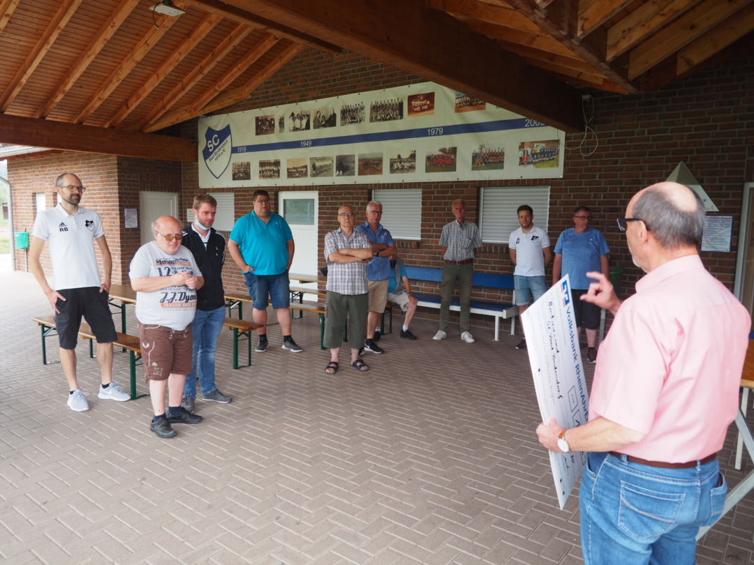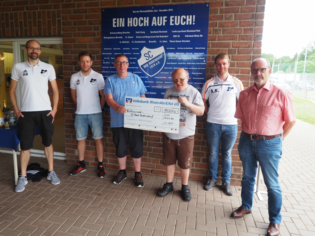 Inzwischen ist aber auch der SC Bad Bodendorf auf dem Sektor Inklusion aktiv geworden. Eigentlich sollte das Ergebnis im Juni in einem Inklusionsturnier vorgestellt werden. Doch da hat die Corona-Pandemie einen dicken Strich durch die Rechnung gemacht. Der Förderverein des Fußballkreises hatte auf Antrag hin 1000 Euro zur Anschaffung von zwei Trikotsätzen bewilligt. Im Rahmen des Turniers war die Scheckübergabe vorgesehen. Die wurde jetzt nachgeholt. Walter Merten, Vorsitzender des Fördervereins, lobte das Engagement der Bad Bodendorfer Fußballer. „Wie ich jetzt erfuhr, hat Initiator Andreas Knechtges bei der Lebenshilfe in Sinzig gearbeitet und dabei Reiner Plehwe kennen- und schätzen gelernt. Er griff die Idee aus Kruft auf und gründete in seinem Heimatort eine Gruppe, in der bis zu 30 Personen miteinander kicken.“