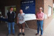 Walter Merten vom Förderverein „Fußballer helfen“ überreicht Andreas Knechtges vom SC Bad Bodendorf einen Scheck über 1000 Euro, der eine beispielhafte Aktion zur Inklusion ins Leben gerufen hat. Foto: Hans-Josef Schneider