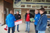 Martin Schönebeck (2.v.l.) und Ingo Puttik (4.v.l.) sind extra 250 km gefahren, um den Verantwortlichen des SCB ihre großzügigen Spenden zu überreichen. Foto: Mike Beitzel